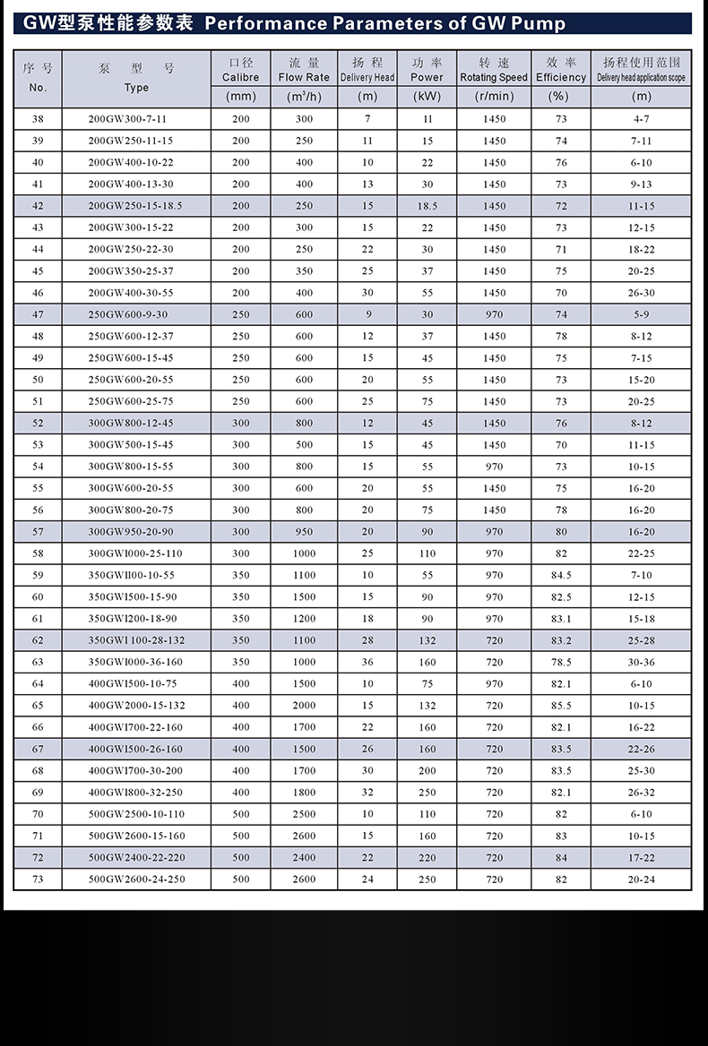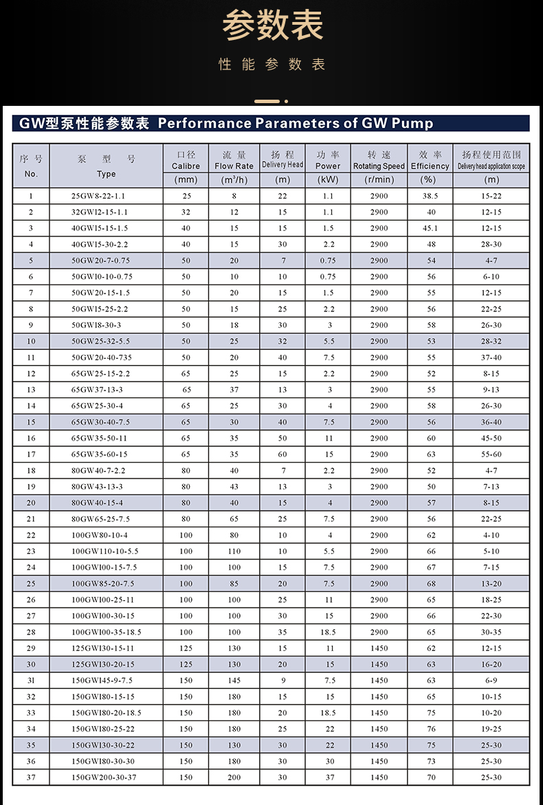 GW型管道式無堵塞排污泵是在引進國外先進技術的基礎上,結合國內水泵的使用特點而研制成功的新一代泵類產品,具有節能效果顯著、防纏繞、無堵塞、自動安裝和自動控制等特點。在排送固體顆粒和長纖維垃圾方面,具有獨特效果。該系列排污泵采用獨特葉輪結構和新型機械密封,能有效地輸送含有固體物和長纖維。葉輪與傳統葉輪相比,該泵葉輪采用單流道或雙流道形式,它類似于一截面大小相同的彎管,具有非常好的過流性,配以合理的蝸室,使得該泵具有效率高、葉輪經動靜平衡試驗,污水提升泵使泵在運行中無振動。