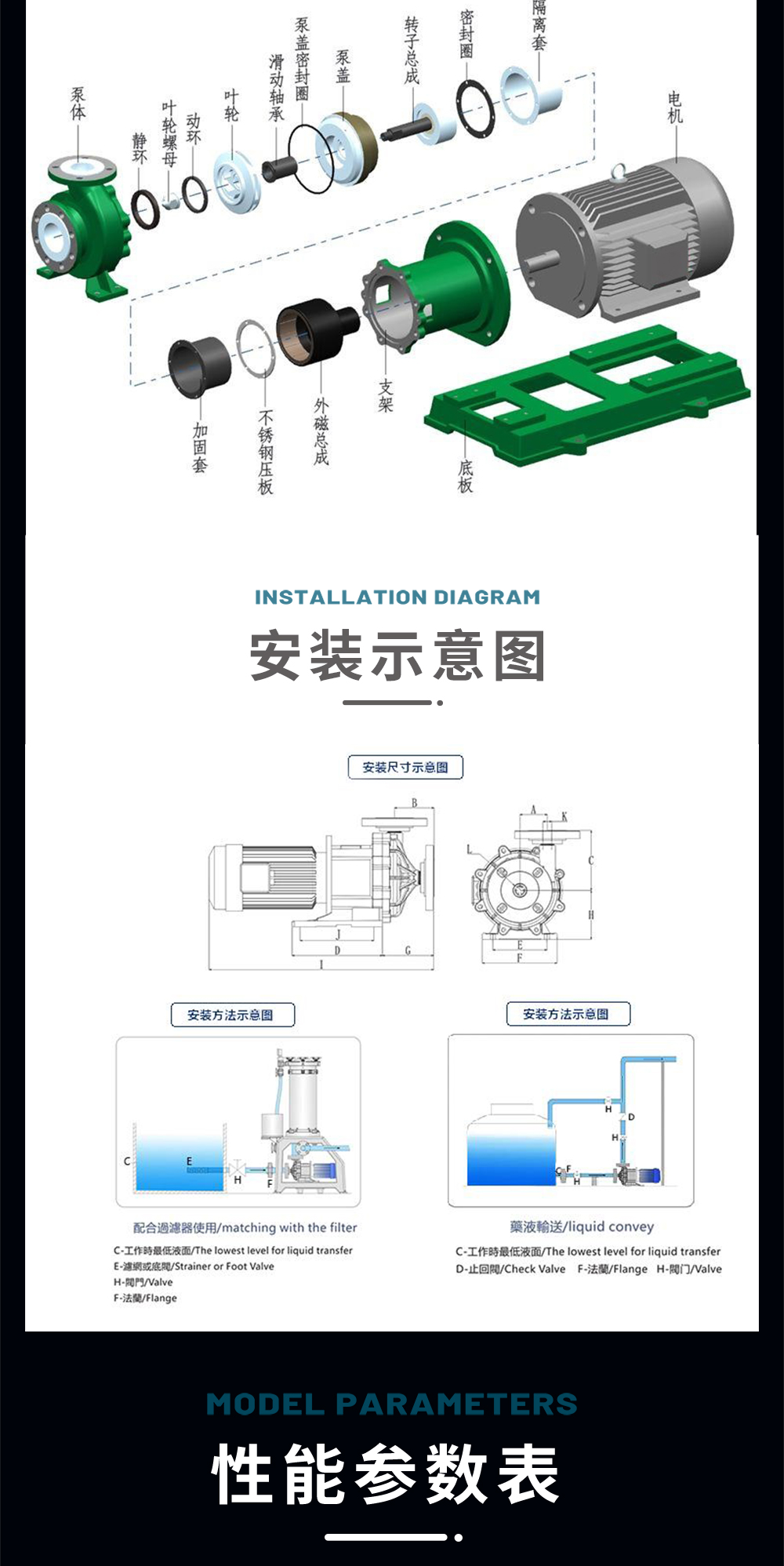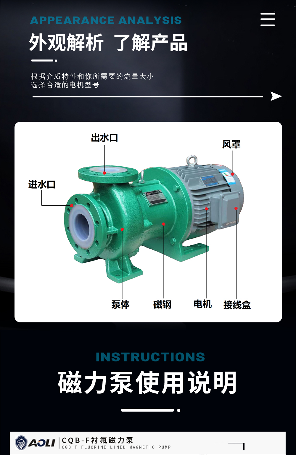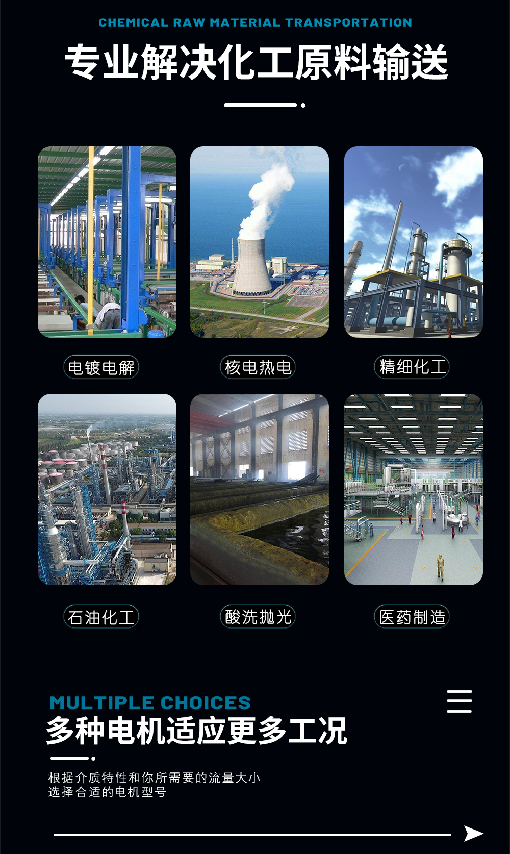 CQB-F氟塑料磁力泵采用磁力耦合傳動,不存在動密封點,因此防止了一般軸傳動式離心泵軸封外跑、冒、滴、漏的現(xiàn)象的塑料磁力泵類型。過流部件采用氟塑料及高純度工業(yè)陶瓷制成,具有優(yōu)異的耐腐性及密封性,因此本產(chǎn)品被廣泛適用于化工、制酸、制堿、冶煉、稀土、農(nóng)藥、染料、醫(yī)藥、造紙、電鍍、電解、酸洗、無線電、化成箔、科研機構(gòu)、國防工業(yè)等行業(yè)。可輸送介質(zhì):輸送任意濃度的酸性、堿性、油類、稀有貴重液體、毒性液體、揮發(fā)性的化學介質(zhì)。特別是易燃、易漏、易爆液體化學介質(zhì)的輸送。