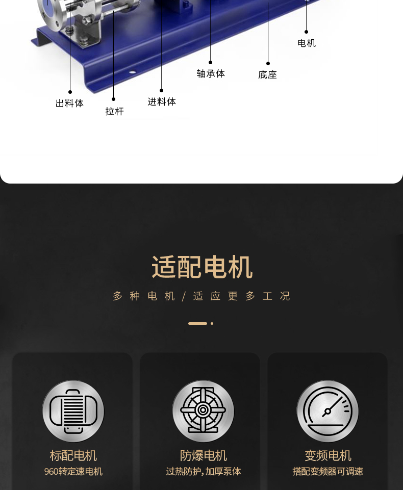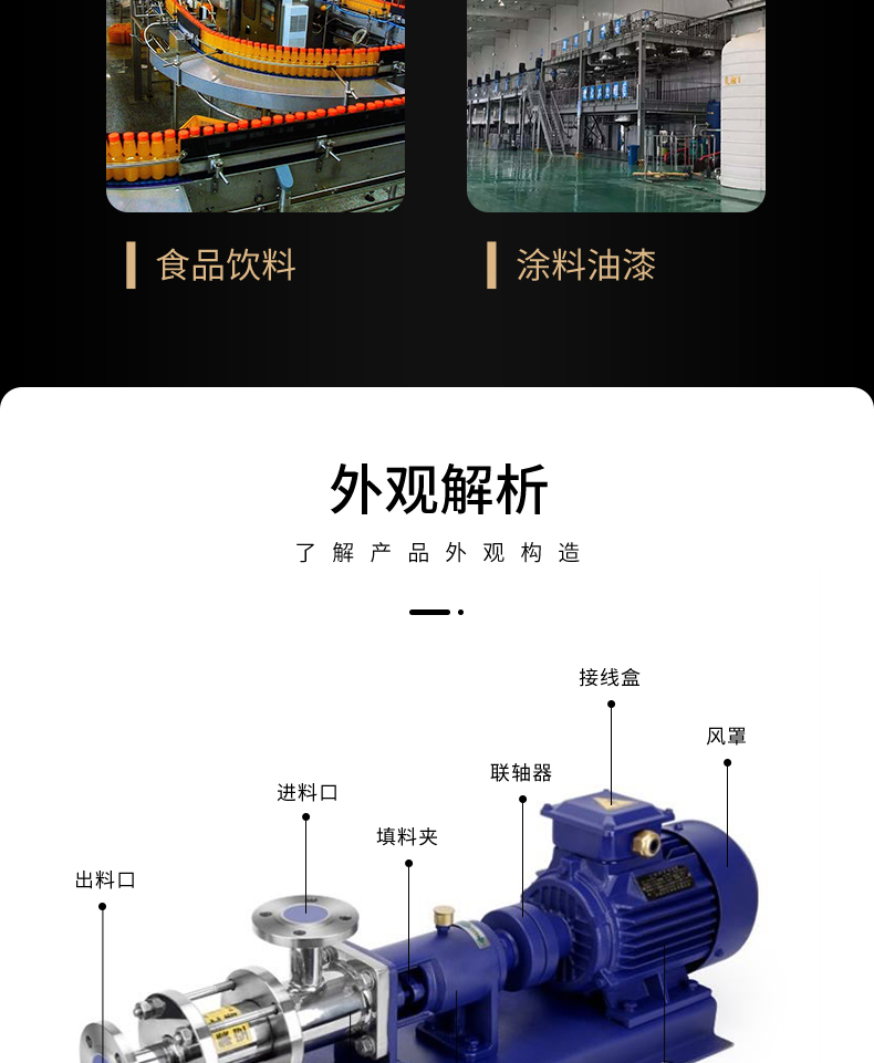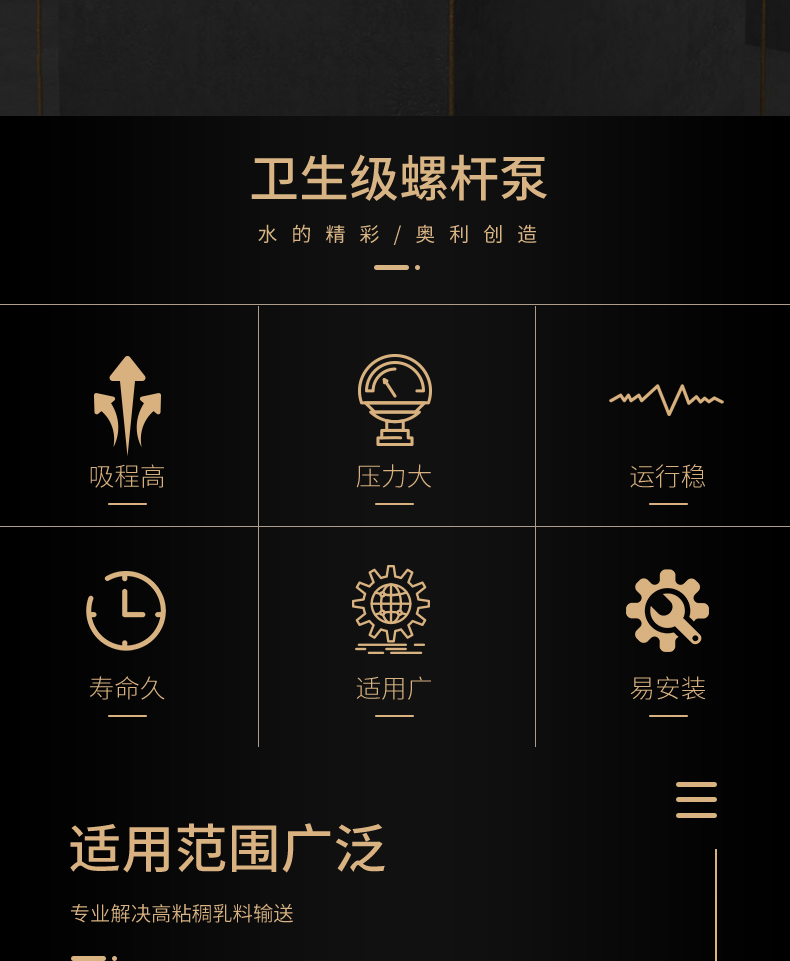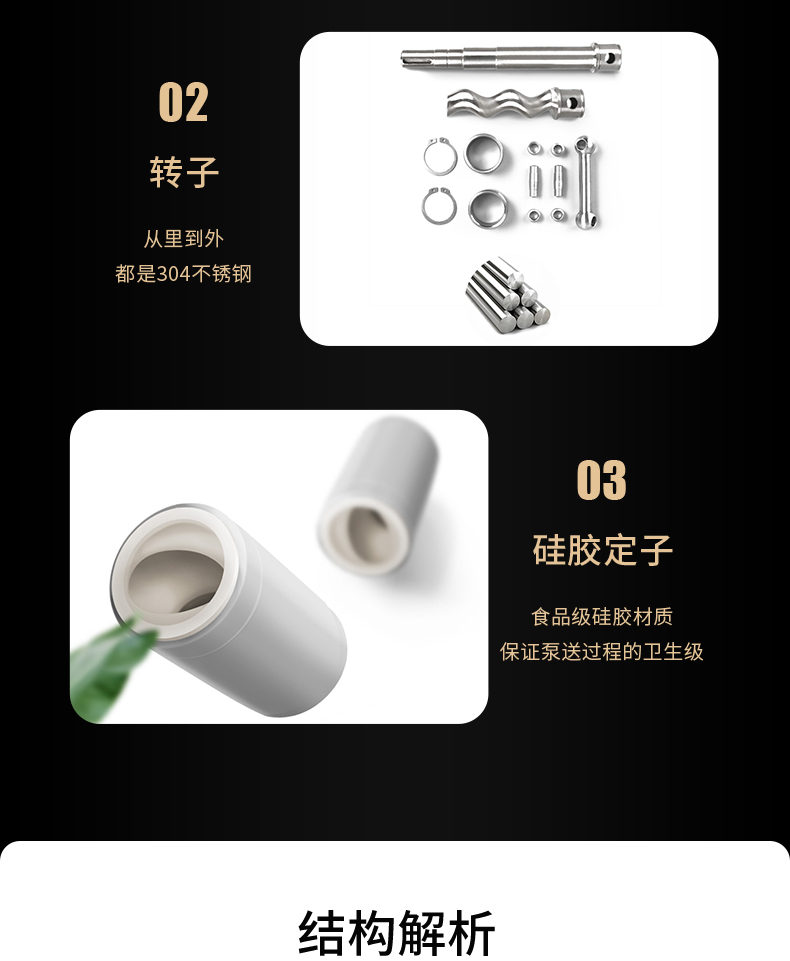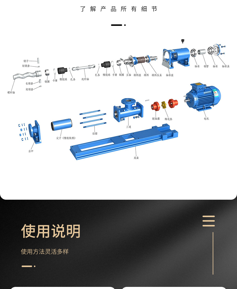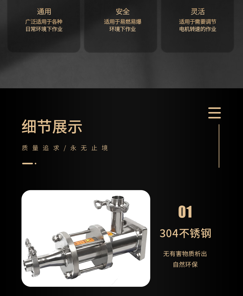 衛(wèi)生級(jí)螺桿泵是按迥轉(zhuǎn)嚙合容積式原理工作的新型泵種,主要工作部件是偏心螺桿(轉(zhuǎn)子)和固定的襯套(定子)。由于該二部件的特殊幾何形狀,分別形成單獨(dú)的密封容腔,介質(zhì)由軸向均勻推行流動(dòng),內(nèi)部流速低,容積保持不變,壓力穩(wěn)定,因而不會(huì)產(chǎn)生渦流和攪動(dòng)。每級(jí)泵的輸出壓力為0.6MPa,揚(yáng)程60m(清水), 適用于輸送介質(zhì)溫度80℃以下(特殊要求可達(dá)150℃)。因定子選用多種彈性材料制成,所以這種泵對(duì)高粘度流體的輸送和含有硬質(zhì)懸浮顆粒介質(zhì)或含有纖維介質(zhì)的輸送,有一般泵種所不能勝任的特點(diǎn)。其流量與轉(zhuǎn)速成正比。