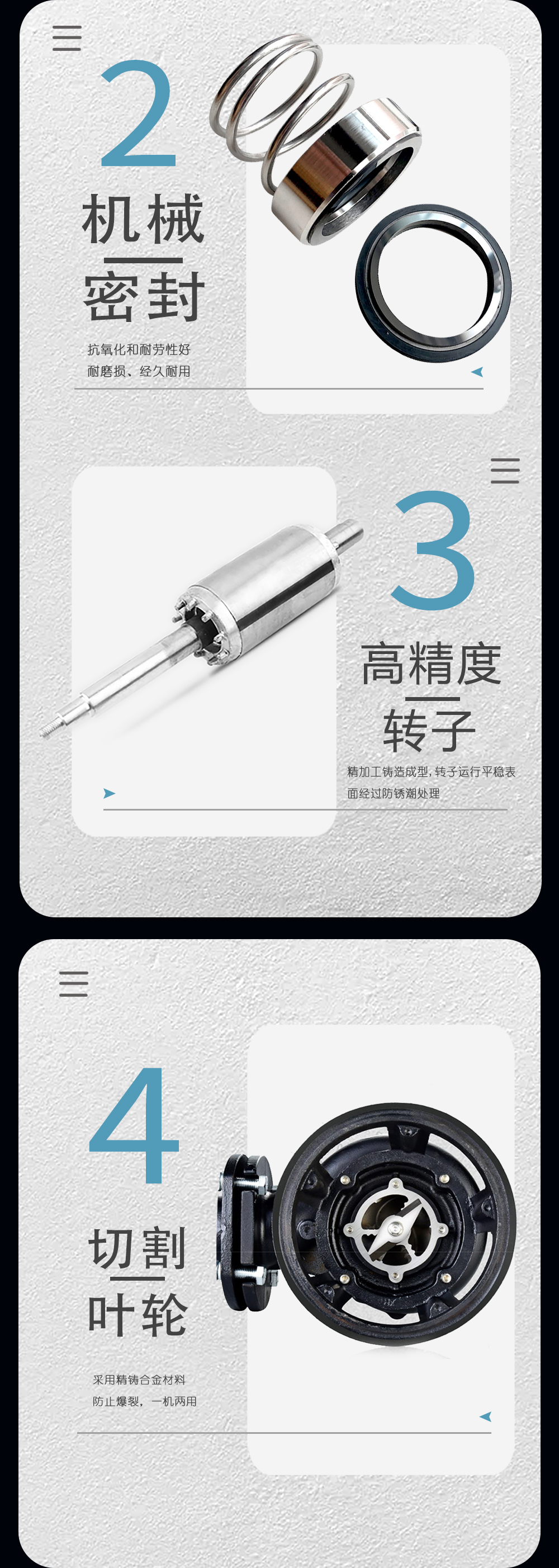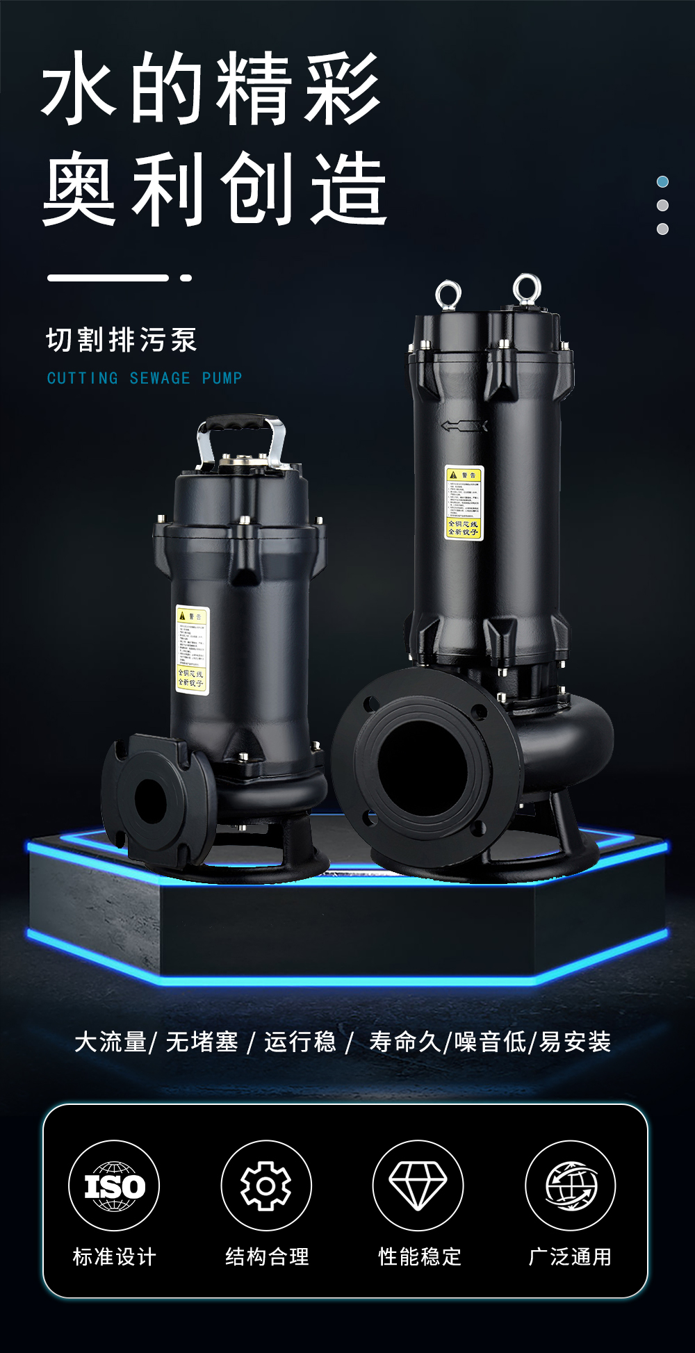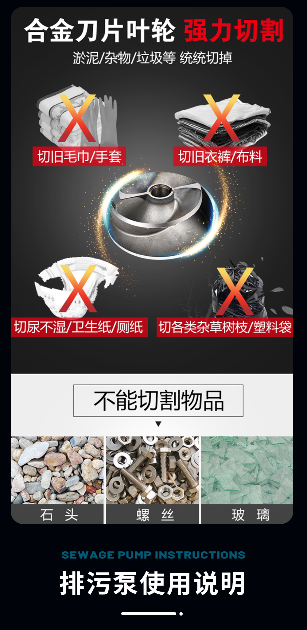 WQK/QG帶切割裝置排污泵具有排污通過能力特別強,帶切割性能好,能將污水中的長纖維、塑料、紙、帶、布條、稻草、繩子等雜質切碎后排出,采用最先進的方法,設計成最合理的水力特性,使電泵可以全揚程運行,優良的干式電機和水泵的最佳組合,無堵塞排污泵使電泵的總效率達到西德abs公司的ass帶切割裝置系列產品相同,電泵采用高質量的硬質合金,雙端面機械密封和骨架油封組面部位,不得超過電動機高度的1/2,抽送污物溫度不超過60℃。