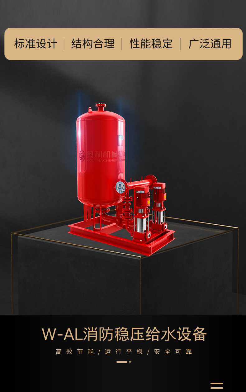 W-AL消防穩壓給水設備是利用食品級橡膠作為氣水隔離的新型設備,一次充氣,常年運行使用。通過電接點壓力表和電控箱控制水泵運行,達到額定的壓力和連續供水。是按照國家消防設計規范GB50016《建筑設計防火規范》及國家標準 GB27898.3《固定消防給水設備第四部分∶ 消防增壓穩壓給水設備》設計、制造的消防專用的增壓穩壓設備。該設備由隔膜式氣壓罐、增壓泵、電控箱、儀表和管路附件等組成,適用于多層和高層建筑工程有增壓要求的消火栓給水系統及自動噴水滅火系統等各類消防給水系統。