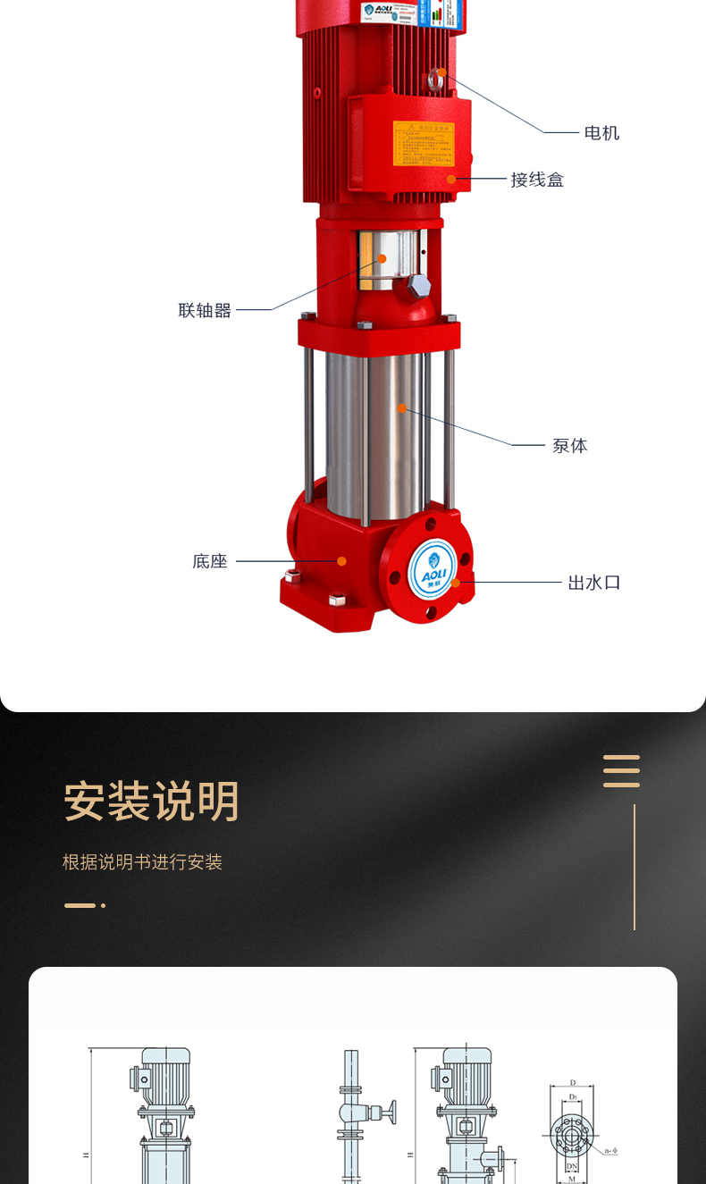 XBD-ALDM立式多級消防穩壓泵,是在原有的ALDM立式多級泵的基礎上根據GB6245《消防泵》國家強制性標準要求進行開發出的新一代中低壓消防穩壓泵組產品。XBD-ALDM多級消防穩壓泵在性能、結構、材料和配套上均滿足GB6245 《消防泵》國家強制性標準的要求。由于采用優秀的水力模型,因此該系列泵具有滿足用戶要求;采用立式泵結構,具有效率高、性能范圍廣的特點,可更好的節省占地面積的優點;采用優質軸承和優質電機,使泵運行更為安全可靠、噪音低、振動小;采用水力平衡軸向力,減少平衡鼓,可使運行更為平穩。其